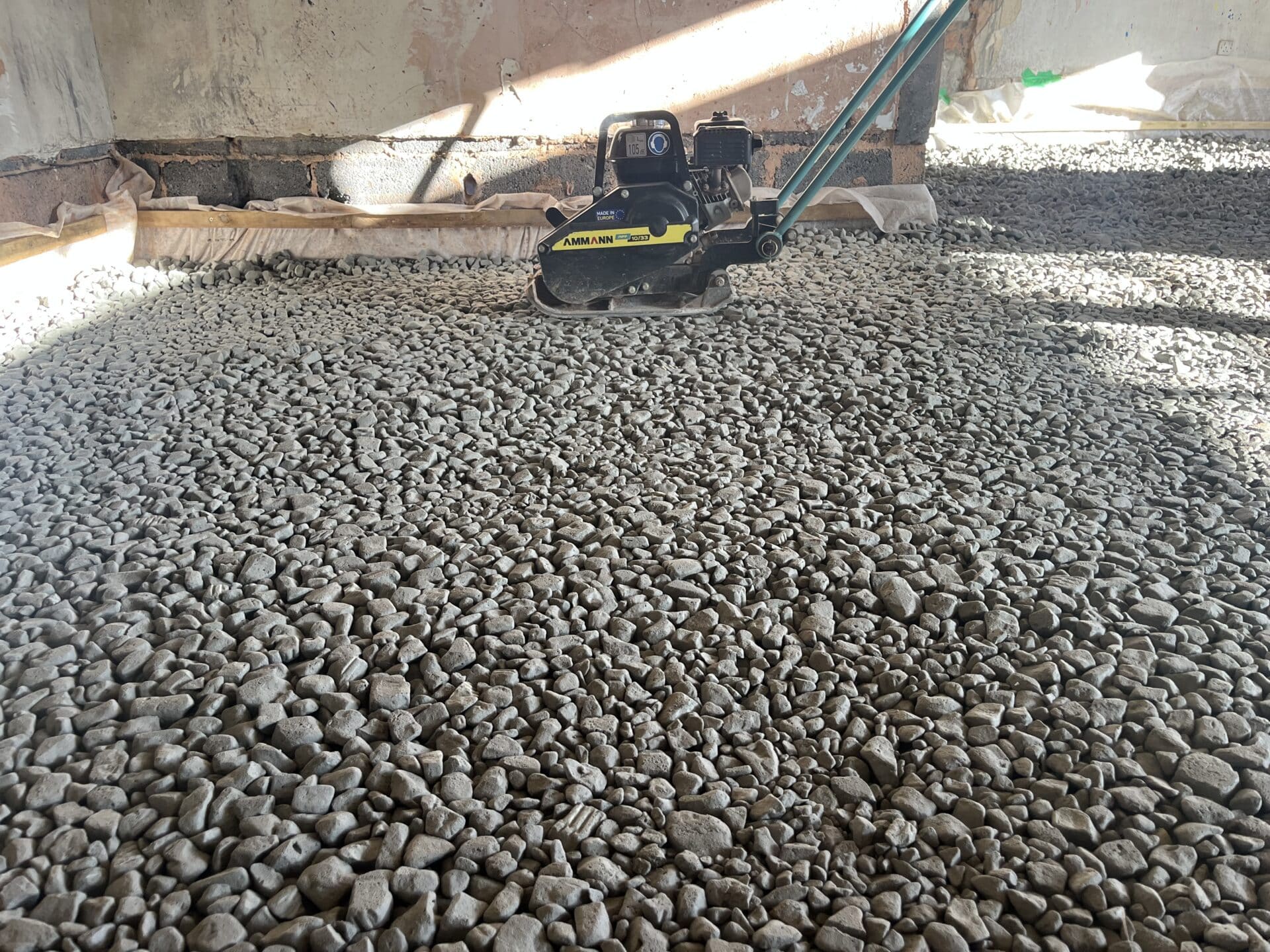 The new product we’re supplying is called FG40, manufactured by Foamed-Glass UK in North Yorkshire. This foamglass knits together firmly and feels very solid when you walk over it, only reducing it’s volume by around 20% after compaction, compared to over 30% with the previous products used.