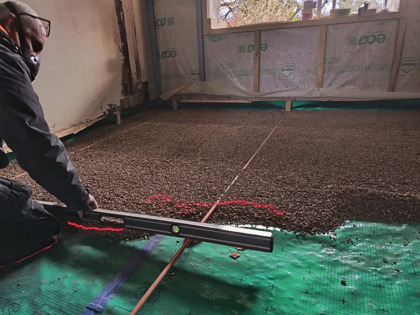 Over the foamglass and membrane we still use the Cemwood CW2000 levelling aggregate to create a dead level surface but the greater solidity of the FG40 product means it is easier to be more accurate with the foamglass levels and reduce the amount of Cemwood required.